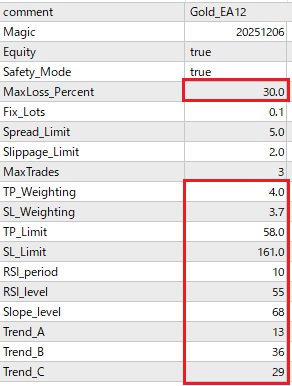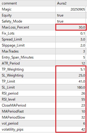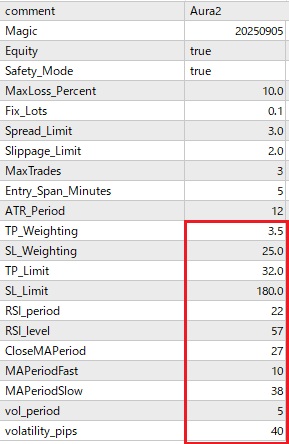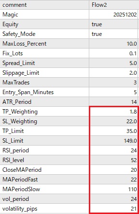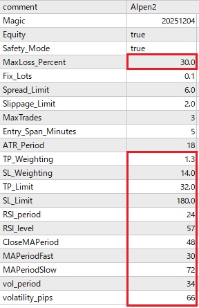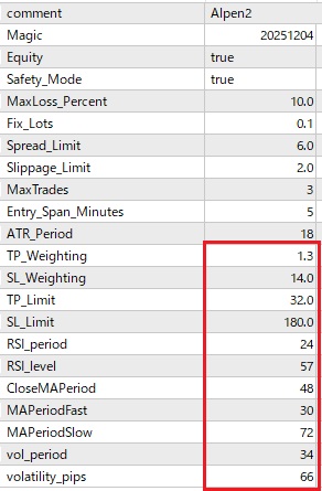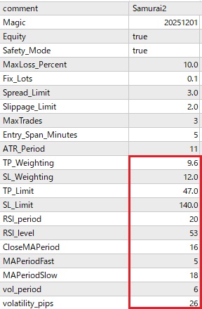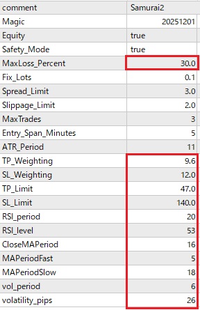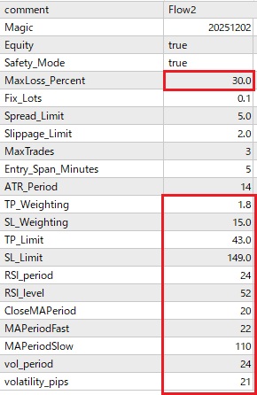しかし、初期設定では取引回数が少ない、もう少し利益率が欲しいという問合せが多数あります。FX取引やMT4 EAの使用に慣れた方は、相場状況に合わせてパラメーターの設定を変更し、取引数や利益を増やすことも可能ですが、そうでない方にとってはハードルが高い場合があります。そこで、以下にリリース中のMT4 EAのパラメーター設定をごく最近の相場に合わせて最適化したものをご案内します。パラメーター設定を以下のように変更していただくと取引数および利益率の増大が見込めます。